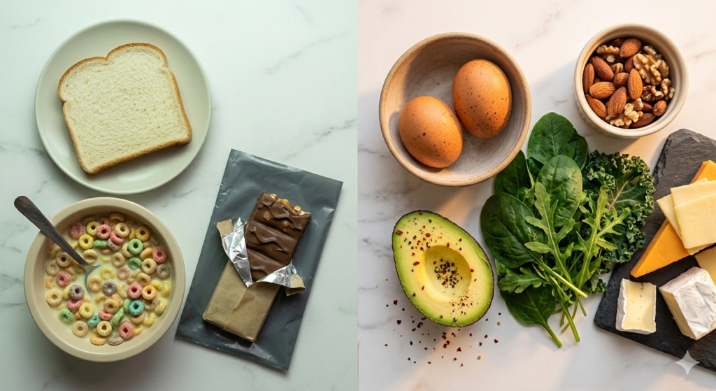 | Mic dejun | Cereale cu lapte sau paine alba cu gem – spike glicemic rapid | Oua cu bacon, avocado sau pancakes keto Ketolicious |